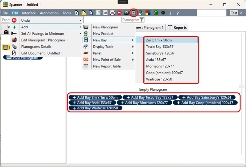 A bay can be added to the planogram in the following ways as shown by the image on the right.