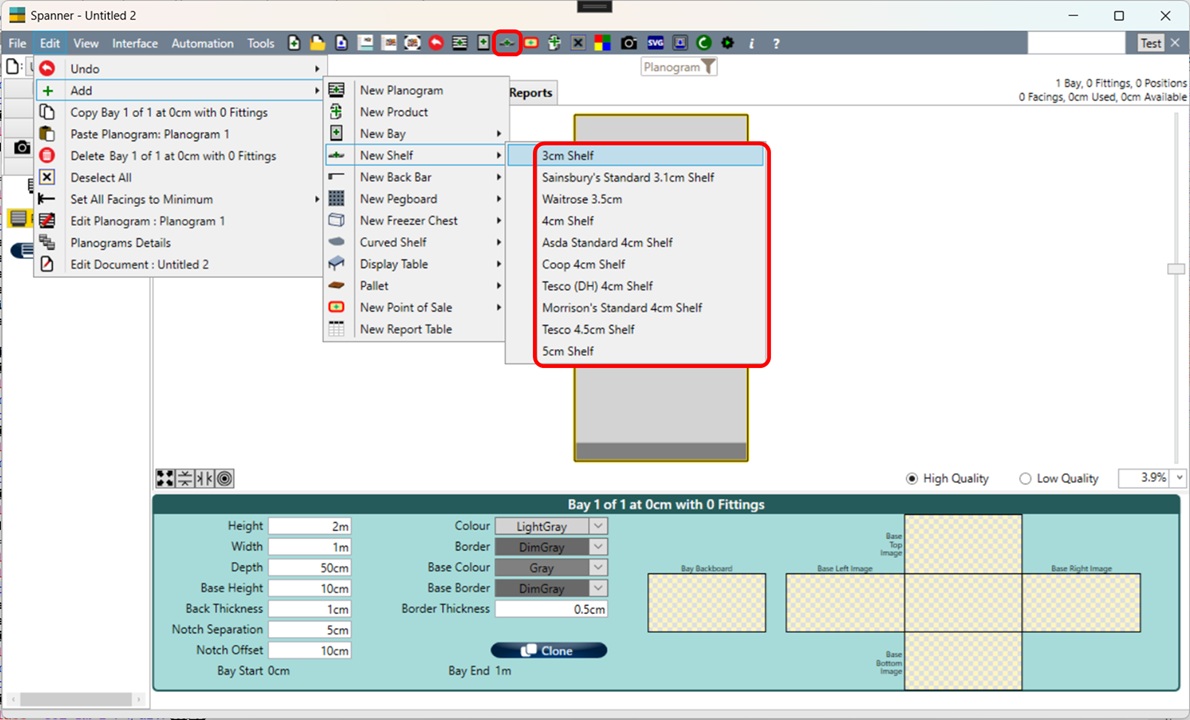 Most fittings hang off a bay, however, a pallet or a display table can form a planogram without a bay. These can be added to the planogram via the Edit menu without a bay being present.
