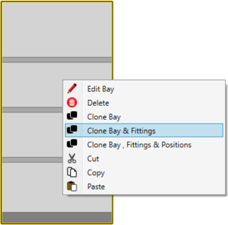 By this manner a multi-bay planogram can be produced. A bay can be cloned by right clicking on a bay and selecting 'Clone Bay & Fittings'.