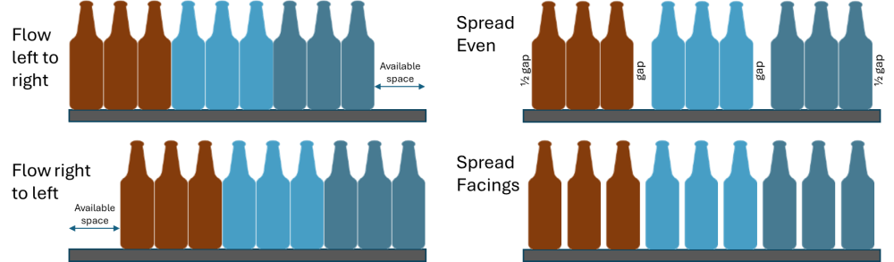 However, when the shelf is full and the planogram is completed it is often more visually pleasing to set the shelf flow to 'Spread Even' or 'Facings'.