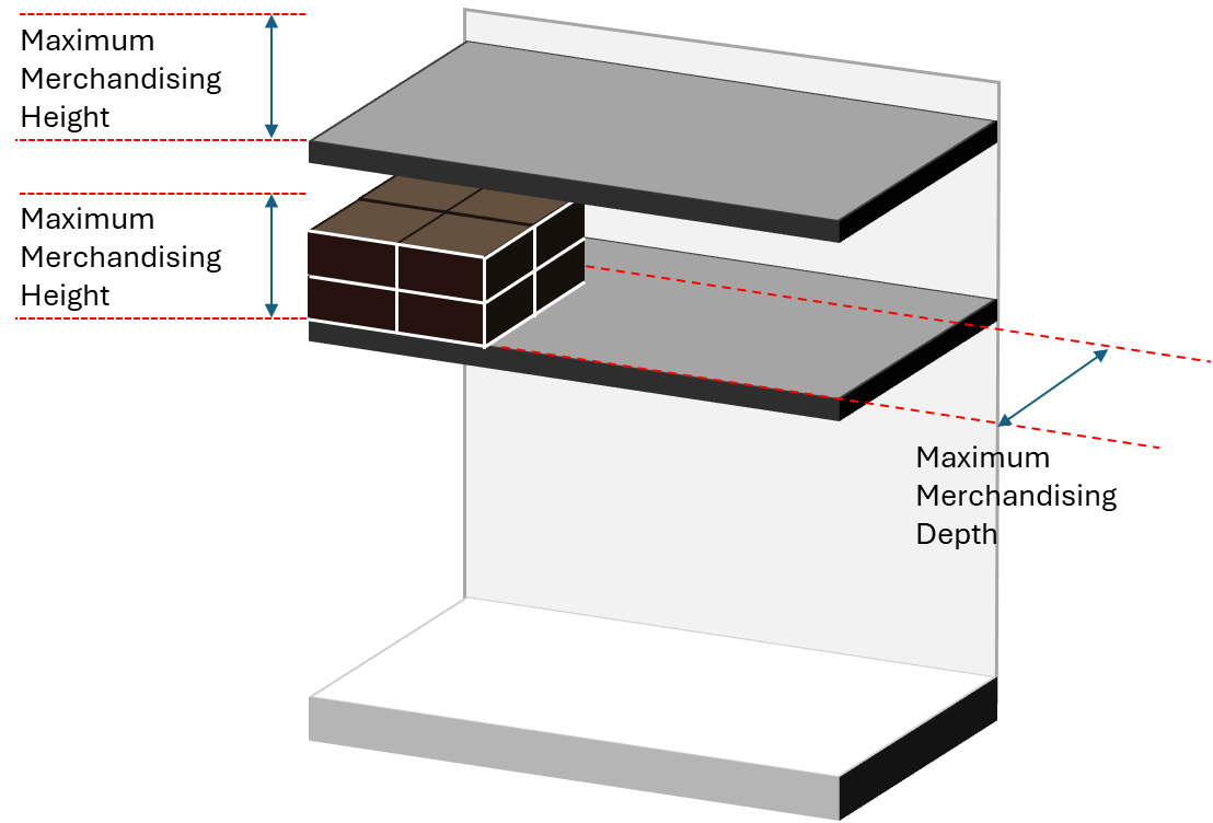Similarly there is maximum merchandising depth. If this is set to zero, then products will add rear facings until the back of the shelf is reached, or another obstruction is reached, or the maximum backwards of the position is reached.