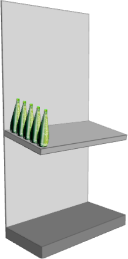 In most instances, shelves are level and perpendicular to the bay backboard. Occasionally shelves are displayed at an angle, usually sloping downwards.