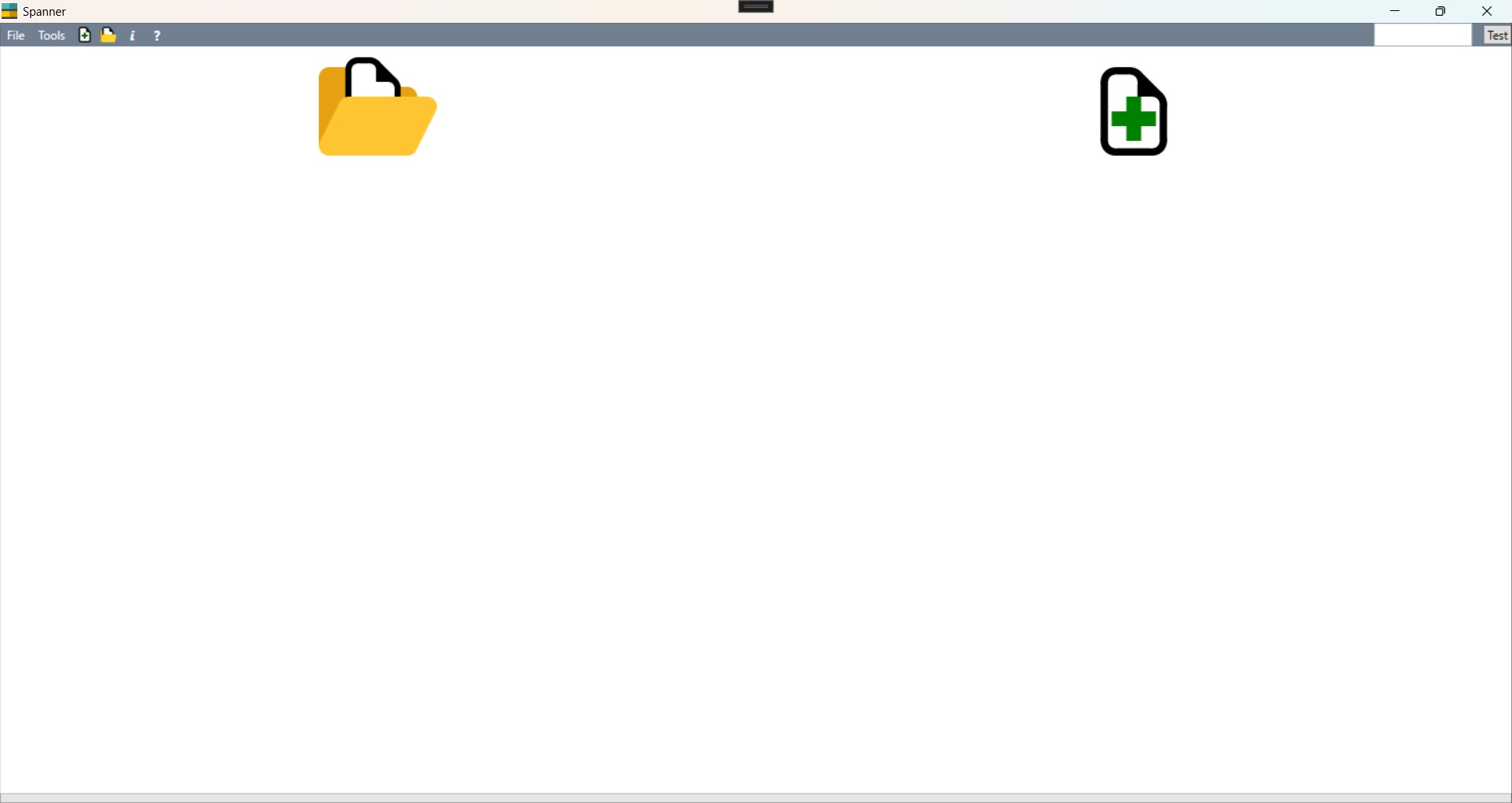 Spanner without any documents open, showing an icon to create a new document or open an existing document.