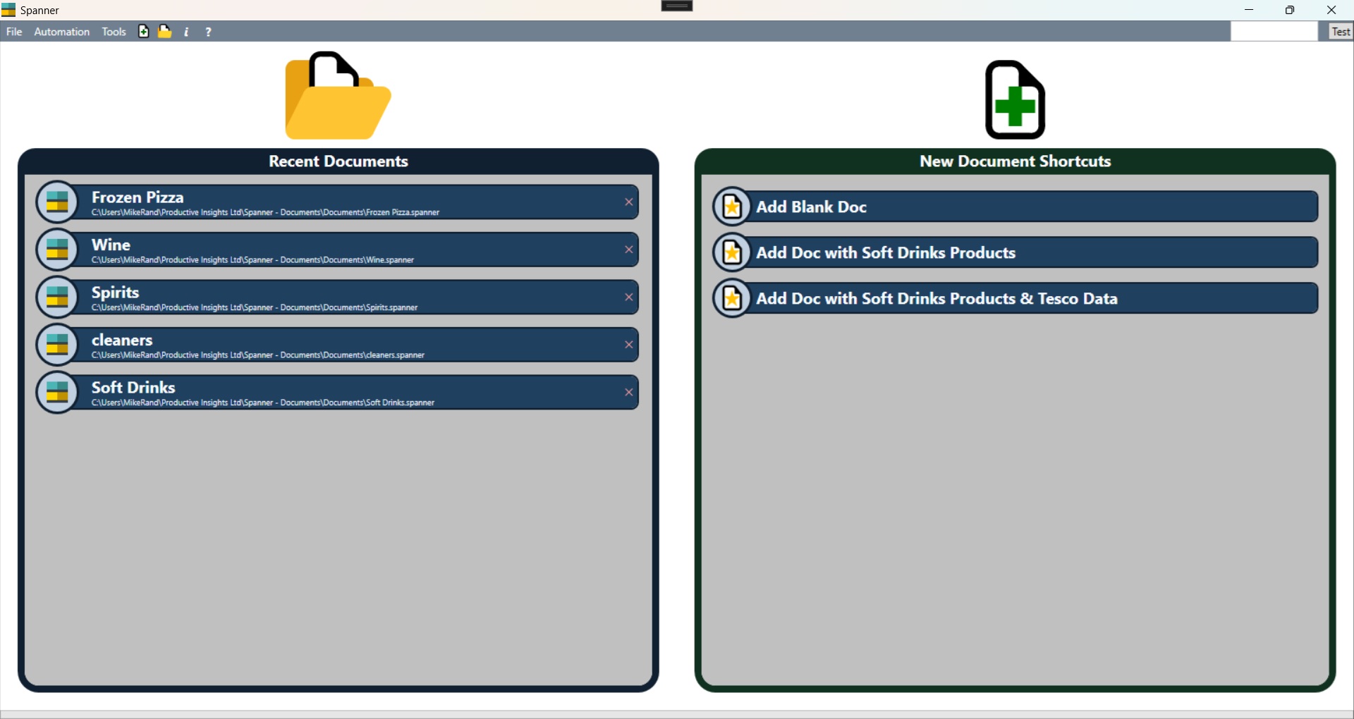 As Spanner is a document based planogramming tool there in an icon to create a new document, and an icon to open an already existing document.