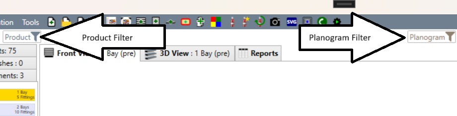 Also just beneath the menu bar are filter tools for filtering the products based on classifications, or filtering the planograms based on properties or planogram name.