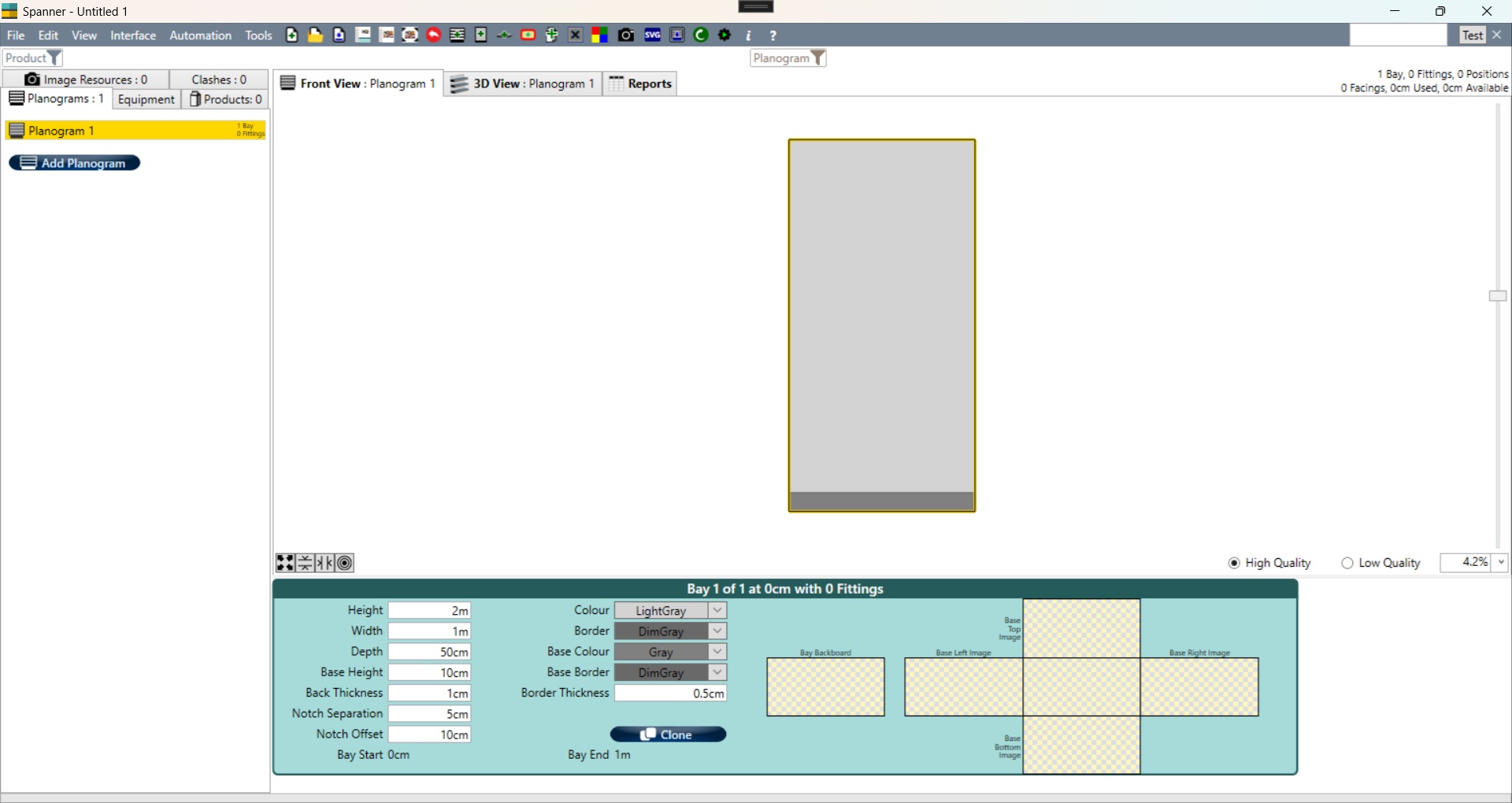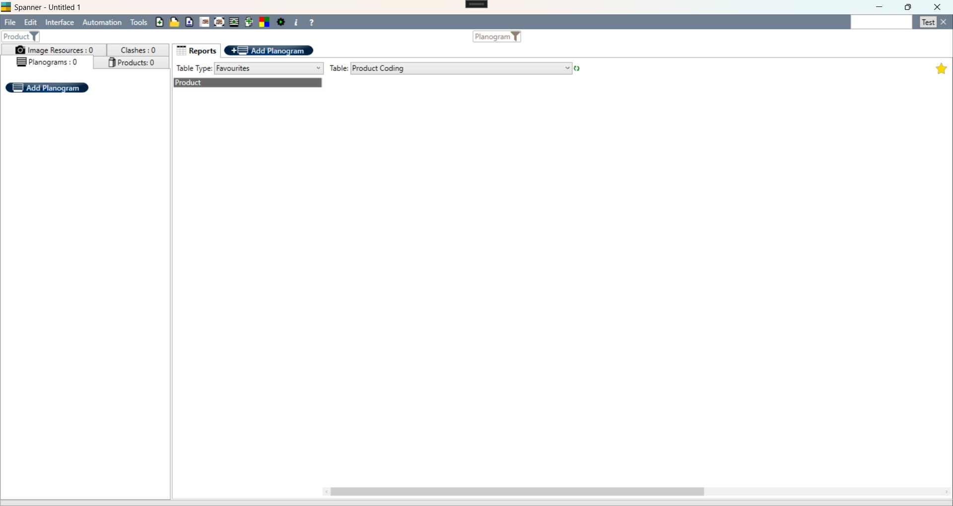 Note that because there are no planograms in this document, the 'Front View' and '3D View' tabs are not showing in the main work area.