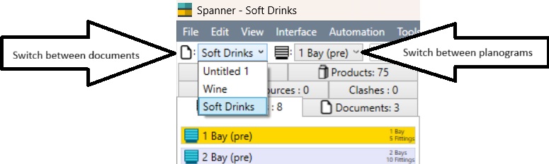 With more than one document open, there is a combobox for navigating between documents. With more than one planogram in the active document there is a combobox for navigating between planograms.